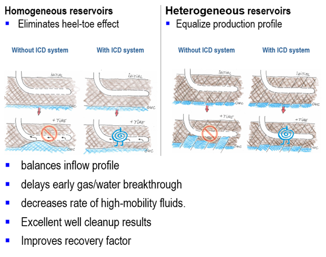 Moreover, the ICD dramatically reduces water and gas rates when these breakthrough phases have higher mobility than the oil.